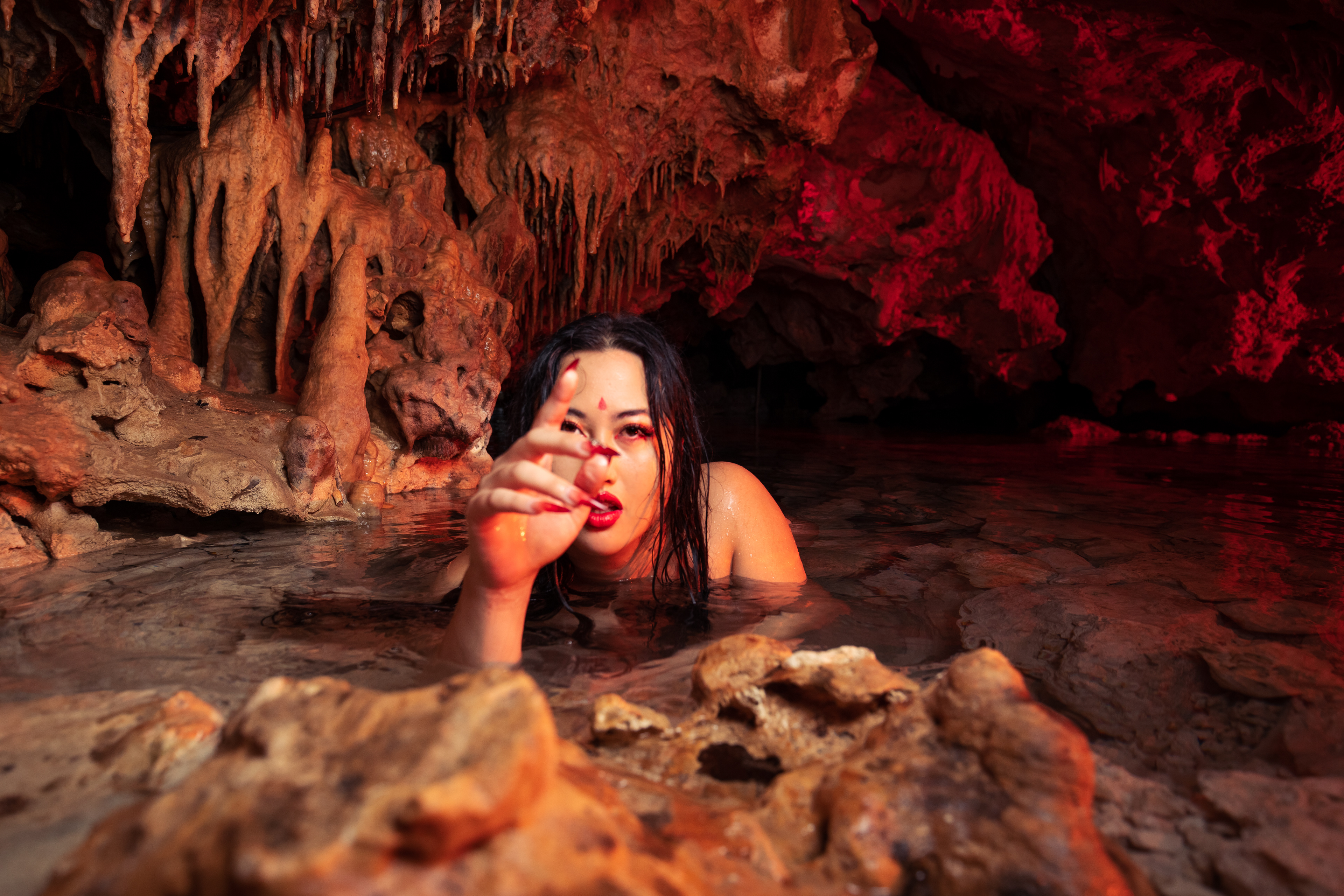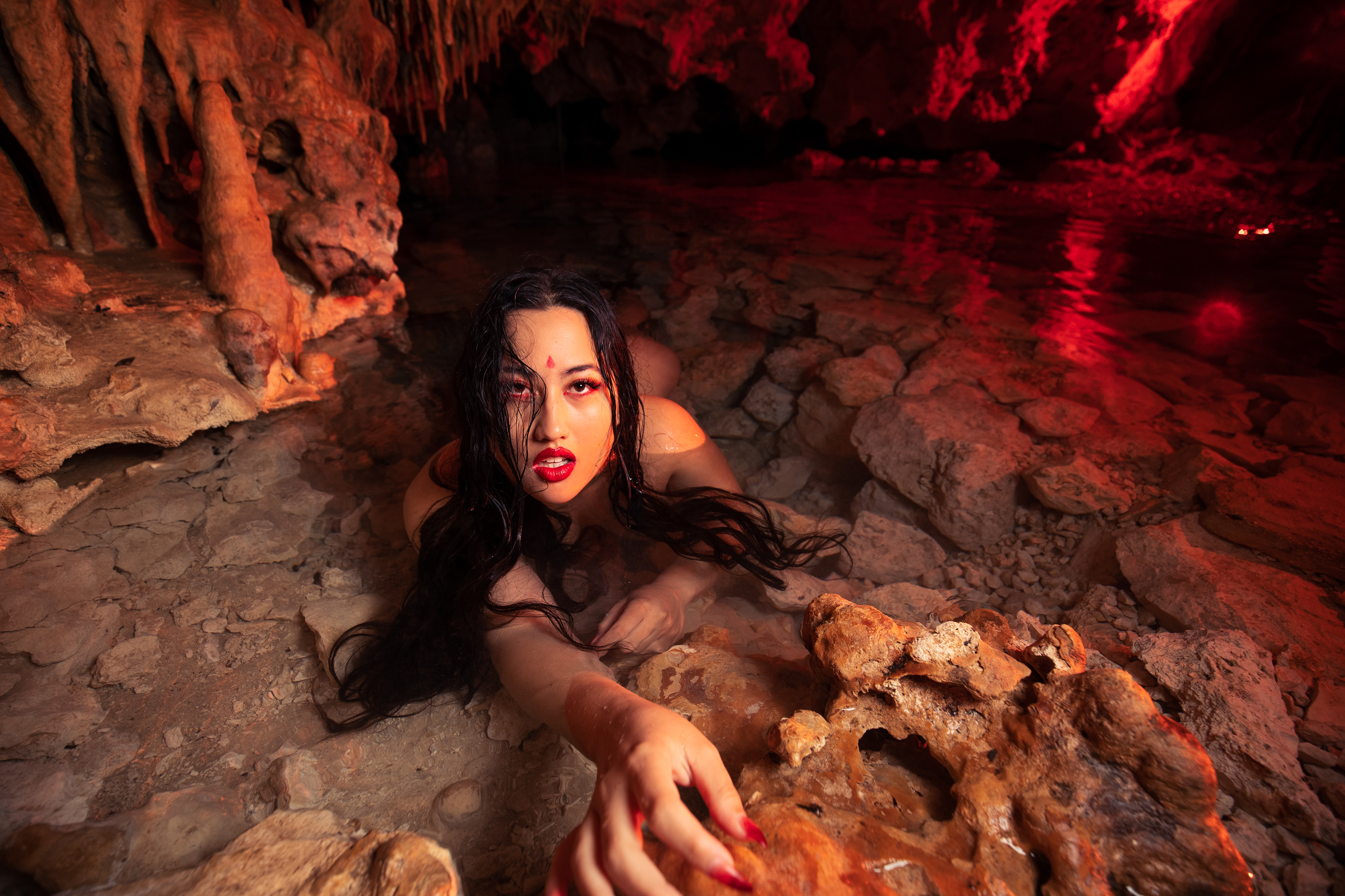Model: Empress Jazmin Wu Location: Underground Cenote in Tulum All visible lighting in this photograph is created by my flashes only. This underground cave was almost entirely dark and I used a flashlight to focus the camera on the model.